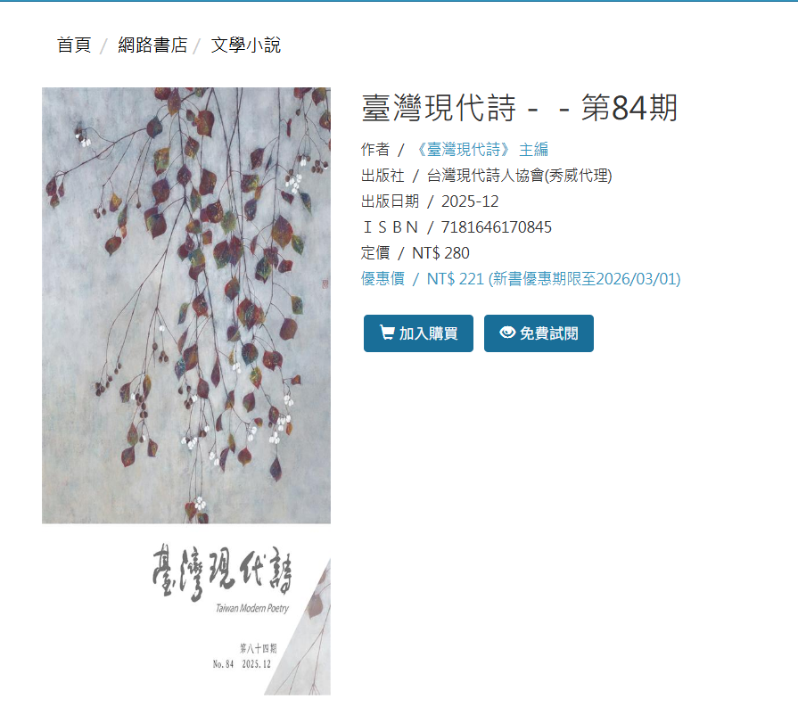 賀! 夏老師〈紙上談詩—設計裡的詩行軌跡〉及〈冬候·一樹白果的等待〉收錄於《台灣現代詩84期》